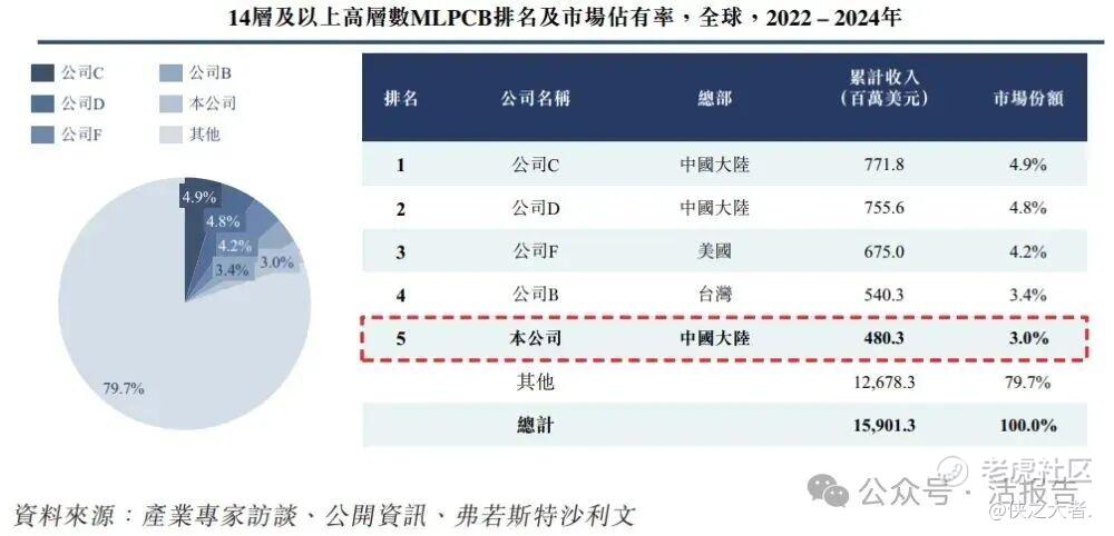 在全球高层数MLPCB(14层以上)市场中,按全球累计收入计,公司以4.803亿美元收入位居全球第五、中国大陆PCB企业第三,市场份额达3.0%;按中国大陆累计收入计,2022至2024年期间位居中国高层数MLPCB(14层以上)市场前十五,市场占有率达1.5%。
