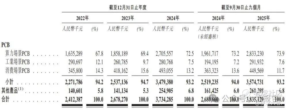 公司收入主要来自PCB产品销售,重大部分来自算力场景PCB(包括AI服务器、通用服务器、数据中心交换机等相关PCB);工业场景PCB和消费场景PCB占比相对较小,2024年分别为7.5%和13.2%,其他产品(如可回收材料销售)获得的收入比例最低,仅6.8%。