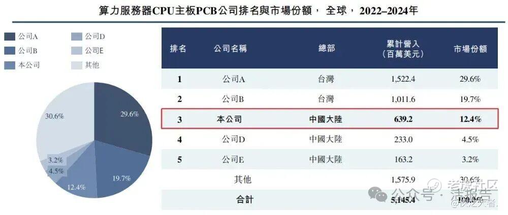 按2022年至2024年全球算力服务器CPU主板PCB累计收入计,本公司以6.392亿美元的累计收入排名全球第三,全球市场份额约为12.4%,且在总部位于中国大陆的算力服务器PCB公司中排名第一。