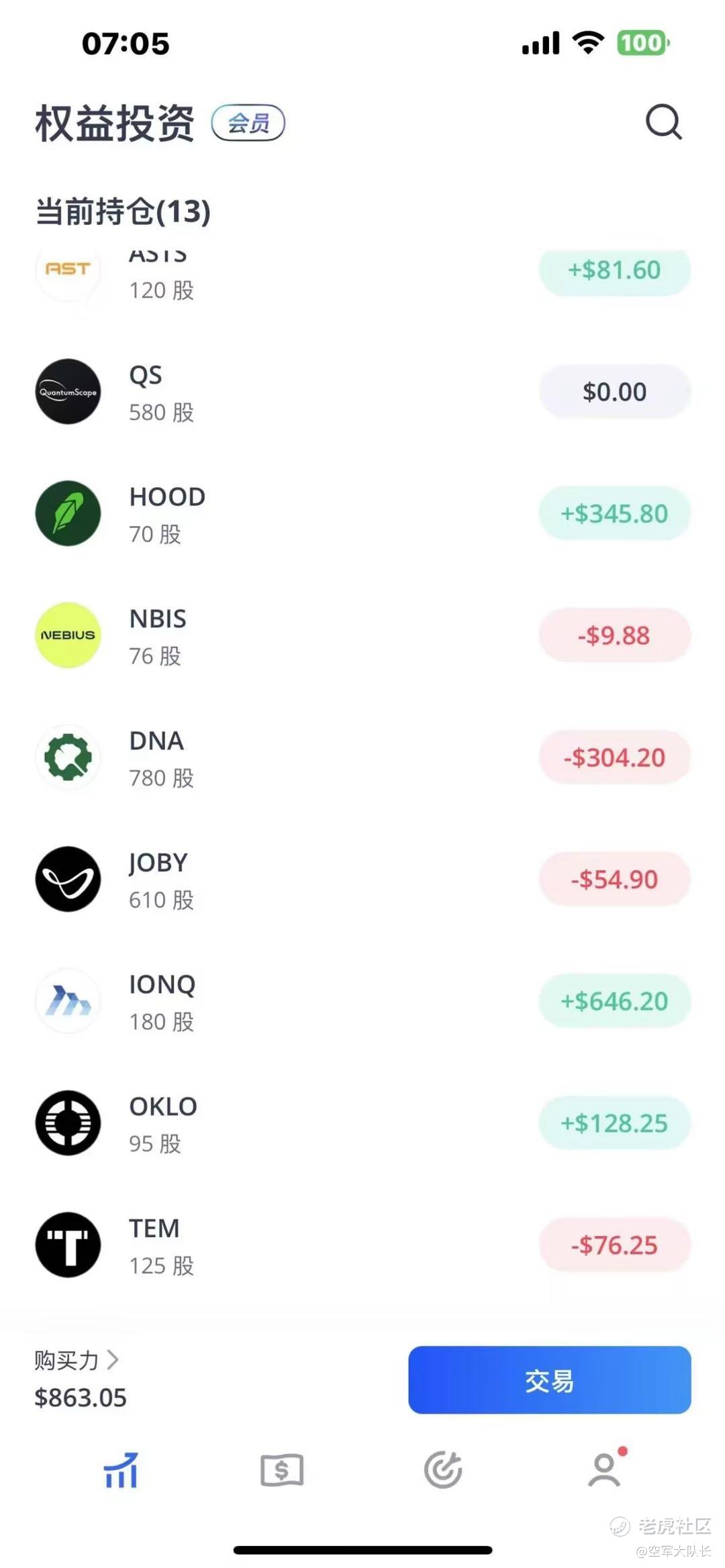 长线股就是平均买,每个买1000美元也可以,当然现在多买没有事,等到我实盘账户的资金到了12万美元以上的时候就不要买了,等我实盘账户的账户到了15万美元的时候,你们可以开始减仓了。我做长线不动,好让大家有一个参考标的。