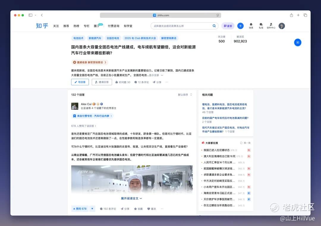 今年许多新能源车产业的热点话题都能在知乎引起广泛关注和讨论。比如前段时间,国内首条大容量全固态电池产线建成的消息,就在站内引发热议,收获超 90 万次浏览。知乎汽车答主们从市场前景、技术解析和竞争格局等多方面展开论述,层层剥开新闻背后的事实。