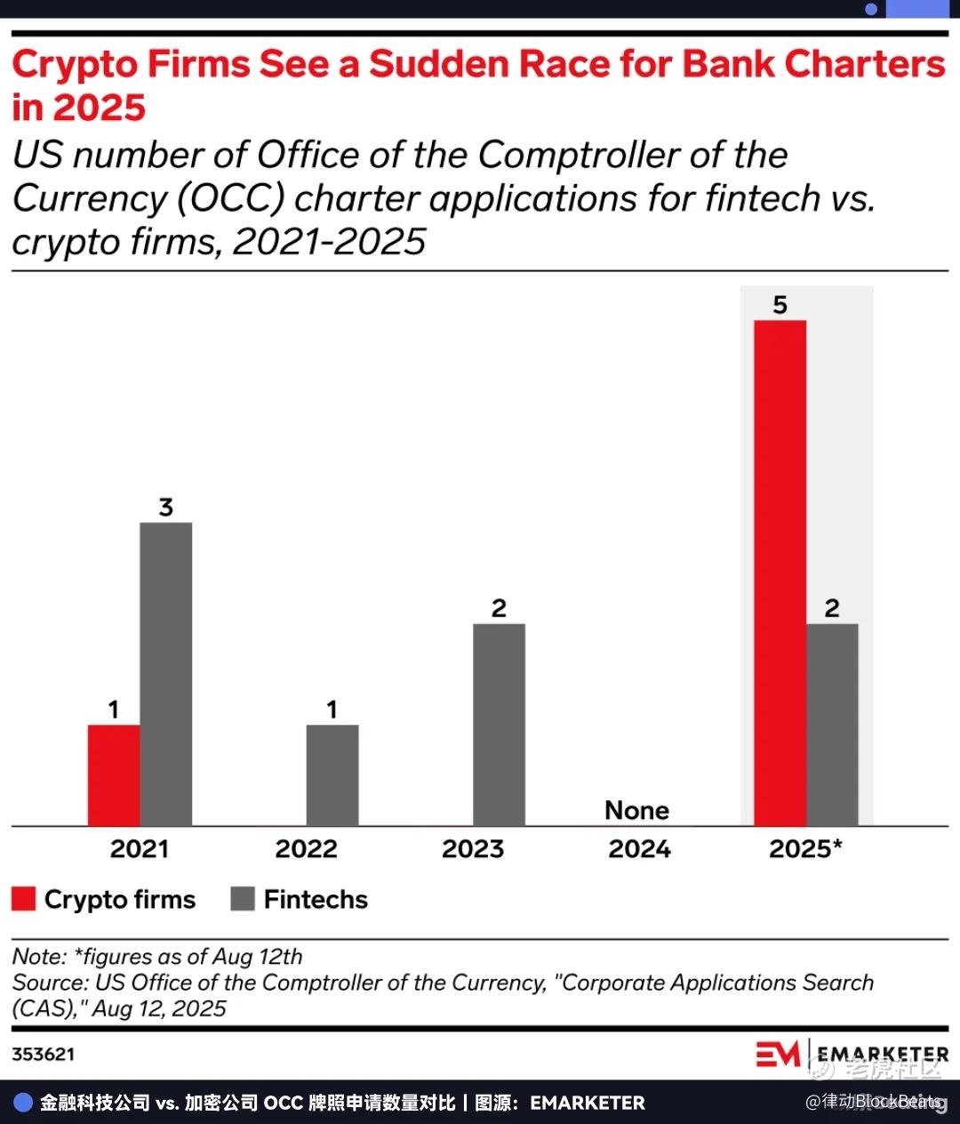 于是,大家开始一窝蜂地抢起了牌照。2025 年美国银行牌照申请数量达到了 20 份的历史峰值,其中仅 OCC(货币监理署)收到的申请就达 14 份,相当于过去四年的总和。