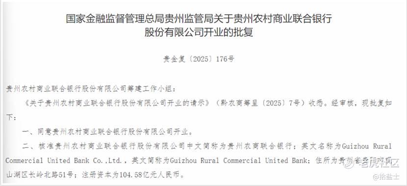 12月15日,国家金融监督管理总局贵州监管局的一纸批复,让贵州农商联合银行正式获准开业。这家注册资本达104.58亿元的省级金融机构,股权结构中出现了一个熟悉的身影——中国贵州茅台酒厂(集团)有限责任公司。