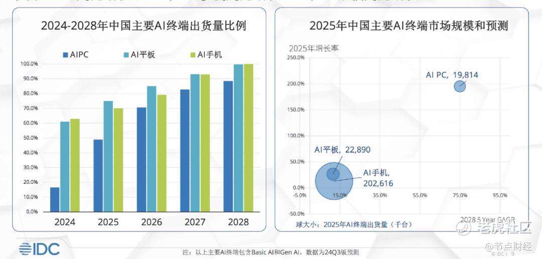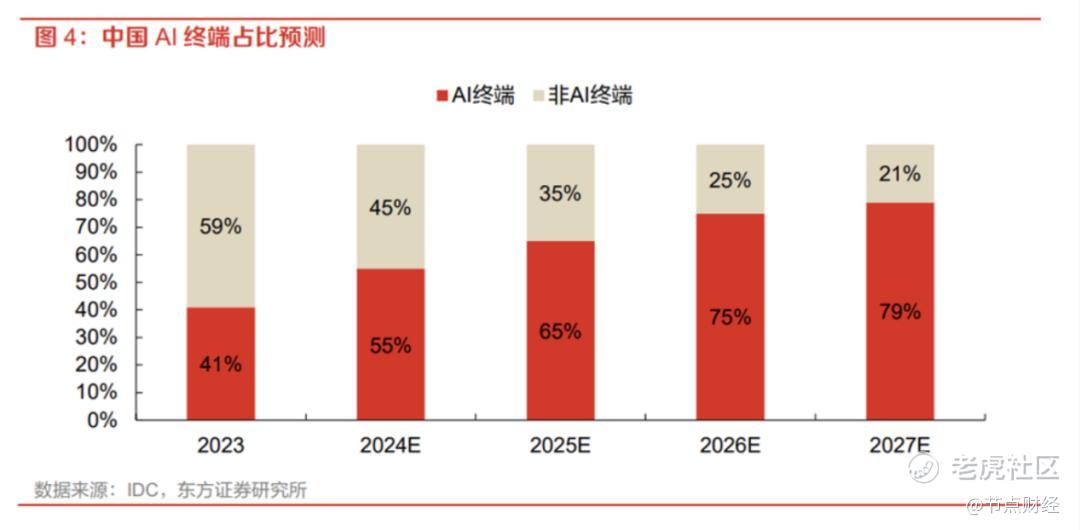 数据直观地佐证了这一趋势:IDC 预测,2026年中国终端设备市场中,近 75% 的设备将在硬件层面具备 AI 算力基础;至 2027 年,这一比例将进一步攀升至 80%。