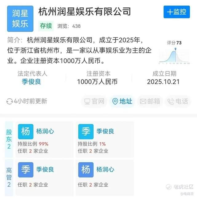 不过,天眼查信息显示,该公司全资股东已从广东辛选控股有限公司变更为自然人季俊良,而季俊良正是蛋蛋新注册的两家公司(杭州润星娱乐有限公司、杭州润心娱乐有限公司)的法人,这两家公司均成立于今年10月,蛋蛋(杨润心)持股比例均为 99%,业务覆盖直播电商、供应链管理等核心领域。