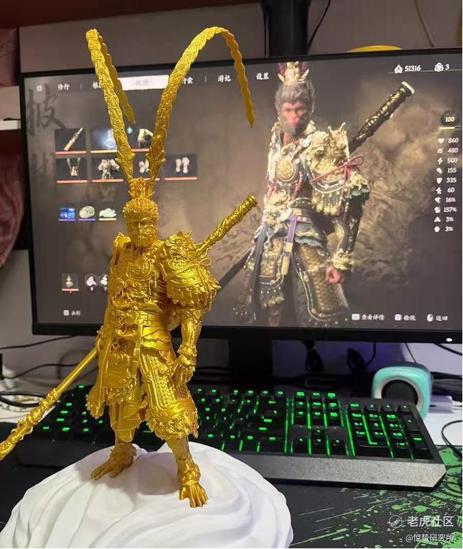 “我现在基本上都是在做成品,包括打印、组装、打磨、喷漆/手绘上色。代打就是图个方便。”代琰成交的第一单是《黑神话:悟空》的“天命人”套装,售价108元,耗时2天多。“那会儿刚开始不是很懂,还有模型打坏的情况。这个108元的价格其实算是低的,因为这个模型拆支撑很难,要拆很久,而且用的是丝绸料。”他告诉惊蛰研究所,这个套装最初的定价其实是158元,但没人买,于是就降到了108元,也是抱着先成交的心态。
