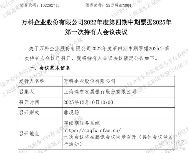 近日,针对已到期兑付的20 亿元债券,万科在上海清算所发布关于“22万科MTN004”2025年第二次持有人会议的议案概要,这是该债券展期方案的第二次推进。