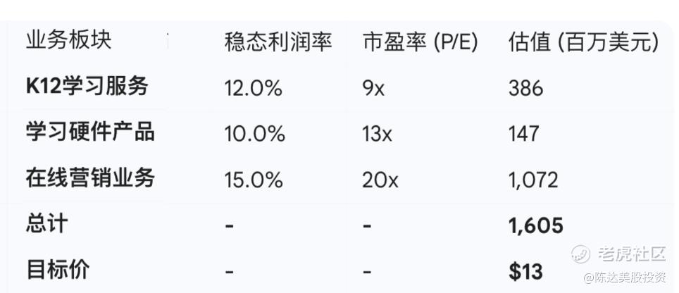 估值采用 SOTP 估值法,加总即可。学习服务,考虑到 K12 业务为主的学习服务业务商业模式相对成熟,采用PE法对高中和 STEAM 业务估值,头部 K12 教育公司线下净利率水平15%,而线上教育净利率,通常低于线下,给其线上学习服务12%稳态净利率。并且给学习服务/智能硬件, 9X/13X 2025E的PE估值。