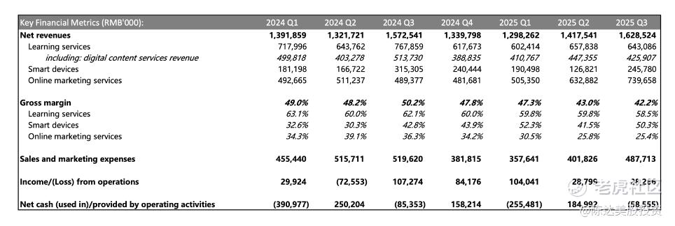 智能学习硬件方面,公司三季度发布了有道 AI 答疑笔 Space X。这个上面讲过这里不复述了,硬件方面业务的逻辑一直是结构性优化,看重健康度,营销投放收缩,聚焦最有竞争力的sku,比如答疑笔,这个更聚焦的产品,有爆款的希望。我看有球友买了答疑笔,解放了被囚禁多年的作业辅导魂。