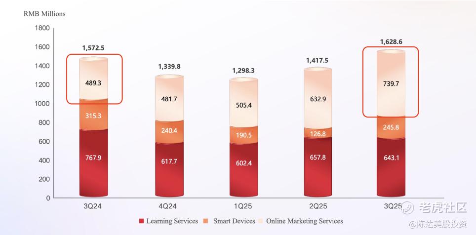 比如AI对于其广告业务的催化,在财报上立竿见影,许多人或许不知道,有道的潜在高毛利、高增长的广告收入,已占其整体收入的将近50%,并以同比50%以上的速度增长(3Q25广告业务创单季度历史新高(7.4 亿),同比增长 51%)。去年此时,广告只有30%占比,在我刚建仓的时候仅仅只有16%。再拉长一点看,2022年Q1,广告业务净收入只有1.2亿元。到今年Q3,已超过7.3亿元,X5 倍以上的增长。三年多的时间,这不比你发际线夺路狂奔的变化更快。