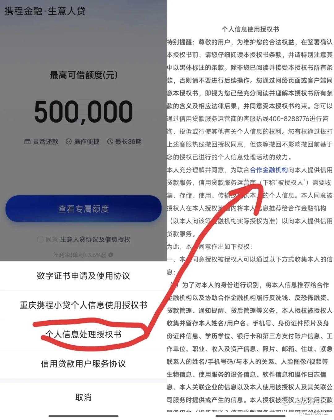 “生意人贷”的合作协议有四份,其中的《个人信息处理授权书》和前述“拿去花丨信用购”的《个人信息处理授权书》内容基本一致,也包含《个人信息使用授权书》、《个人信息对外提供授权书》和《敏感个人信息授权书》三份子协议。三份协议里也均提到,“本人充分理解并同意,为联合合作金融机构向本人提供信用消费服务,服务运营商需手机、存储、使用、传输及提供本人的个人信息”。