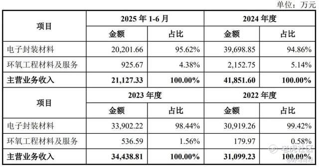 电子封装材料是创达新材的主要产品和主要收入来源,2022年—2024年及2025年上半年,该业务分别实现收入3.09亿元、3.39亿元、3.97亿元和2.02亿元,分别占比99.42%、98.44%、94.86%和95.62%。