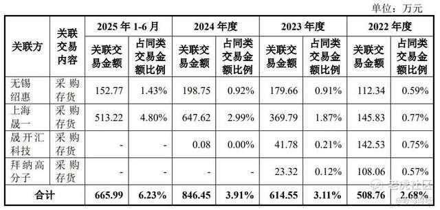 尽管转让了股权,但创达新材对无锡绍惠及其关联方的采购金额却逐年增长,2022年—2024年及2025年上半年分别为508.76万元、614.55万元、846.45万元和665.99万元,分别占公司各期采购总额的2.68%、3.11%、3.91%和6.23%,采购额和采购占比均逐年增加。2024年,无锡绍惠已成为创达新材的第五大供应商,并在2025年上半年成为第四大供应商。