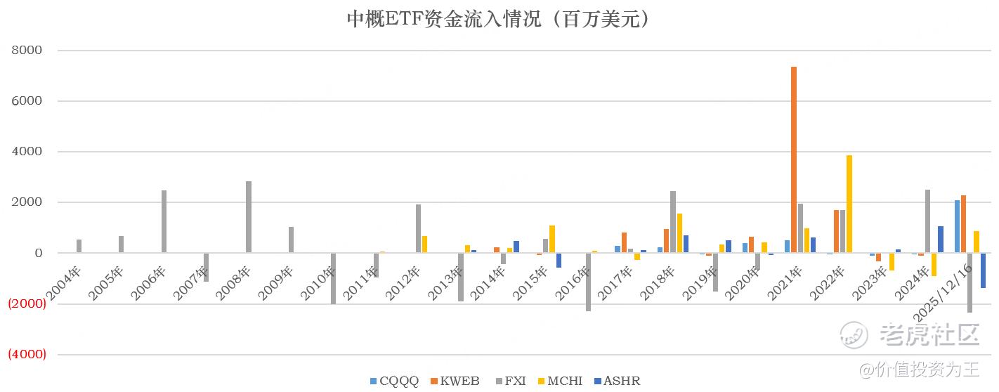 在DeepSeek效应下,今年美国投资者大幅买入中概ETF,如截止12月17日,规模最大的中国海外互联网ETF( $中国海外互联网ETF-KraneShares(KWEB)$ )录得22.8亿美元资金流入;规模第四大的中国科技指数ETF( $中国科技指数ETF-Guggenheim(CQQQ)$ )也吸金20.9亿美元;iShares安硕MSCI中国ETF( $中国ETF-iShares MSCI(MCHI)$ )也吸引到8.7亿美元,为此前两年的流出划上句号: