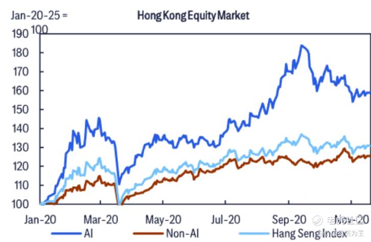 从港股来看,AI概念股的走势明显强于非AI及恒生指数: