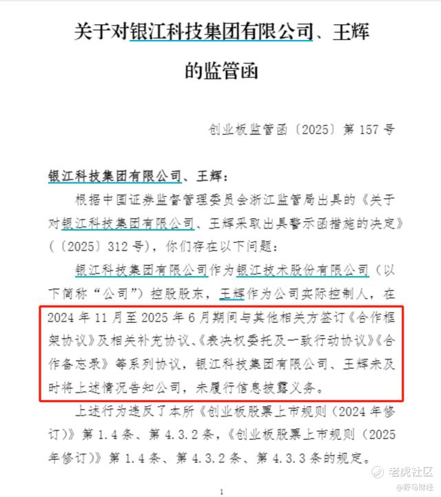 但值得注意的是,12月16日,深交所对银江集团及王辉出具的警示函中认定:“2024年11月至2025年6月期间与其他相关方签订《合作框架协议》及相关补充协议、《表决权委托及一致行动协议》《合作备忘录》等系列协议,银江科技集团有限公司、王辉未及时将上述情况告知公司,未履行信息披露义务。”