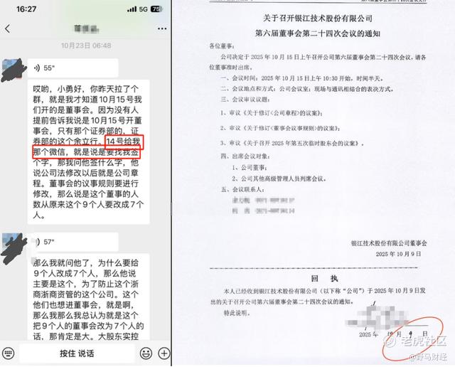 11月13日,彭小勇在微信上收到一条ST银江代理董事长、代理董秘韩振兴向其发送的会议通知,称公司第六届董事会第二十六次会议将于五天后的11月18日上午10点30分召开。