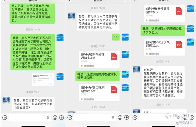 11月27日凌晨,彭小勇就将起诉ST银江并被立案受理一事,通过微信告知ST银江代理董事长、代理董秘韩振兴。对方要求其提交诉讼材料。11月28日下午15:00点,彭小勇将《案件受理通知书》发给对方,对方回复称会尽快核实。