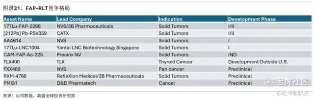 据高盛数据,FAP放射性配体疗法全球竞争格局良好,海外进入临床阶段的资产普遍处于临床早期和临床前阶段,其中布局深度最高的莫过于核药巨头诺华,FAP是继SSTR和PSMA之后重注的RDC开发方向,这反映出其背后巨大的潜力。