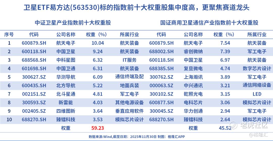 从卫星ETF易方达(563530)标的指数前十大成分股看,其权重集中度显著高于同类其他指数,更聚焦赛道龙头,或更受益于初期的产业趋势。
