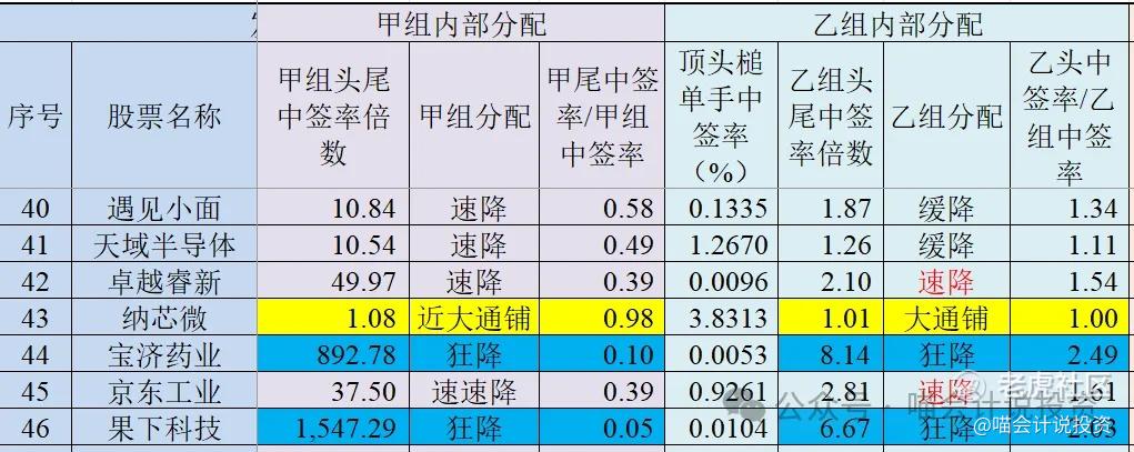 乙组分配:狂降,乙头单手中签率万分之6.92(为乙组均值的2.03倍),2500手中1.73手;顶头槌1.7万手也就中1.76手,跟乙头基本没区别!