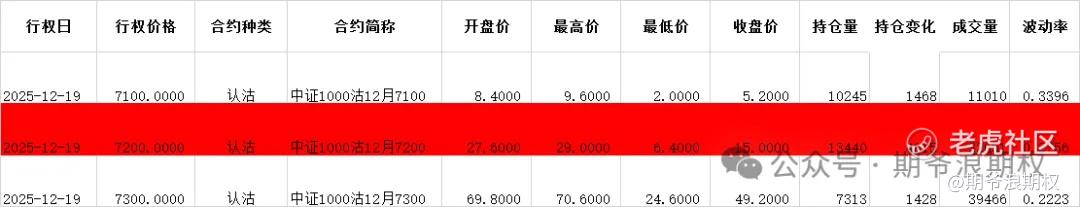 (4)中证1000期权:12月最大持仓范围7200-7400,今收7272.40,下跌0.22%。期权12月主力合约,认购以减仓为主,集中在7000-8000,合计4200张;认沽增仓集中在7000-7300,合计7800张,剩下的都是减仓,集中在6600-6900,合计1200张。变化超过1000张的仓位如下,红色是增仓较大的。