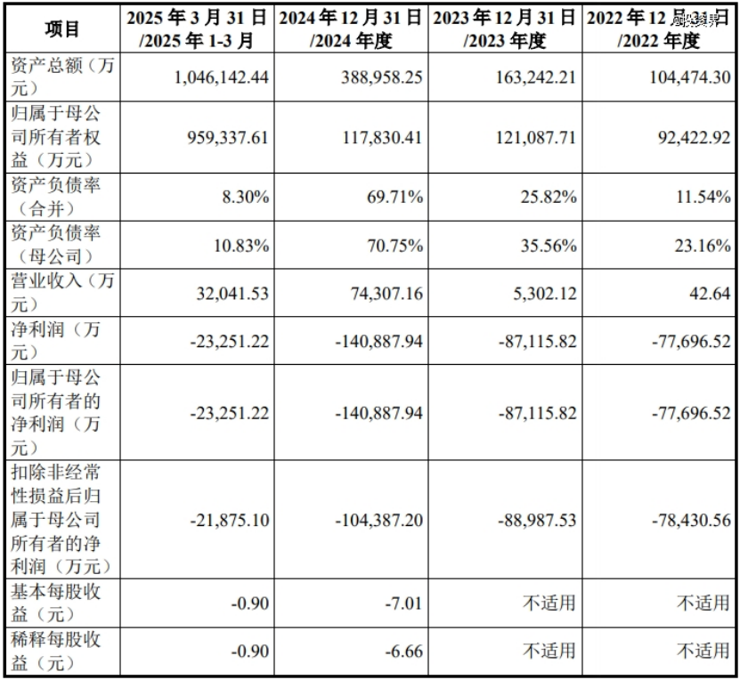 但需要注意的是,沐曦成立至今尚未盈利。招股书披露,2022至2024年、2025年1至3月,营业收入分别为42.64万元、5302.12万元、7.4亿元和3.2亿元,归母净利润分别为-7.8亿元、-8.7亿元、-14亿元和-2.3亿元。根据沐曦预计,公司达到盈亏平衡点的预期时间最早为 2026 年。