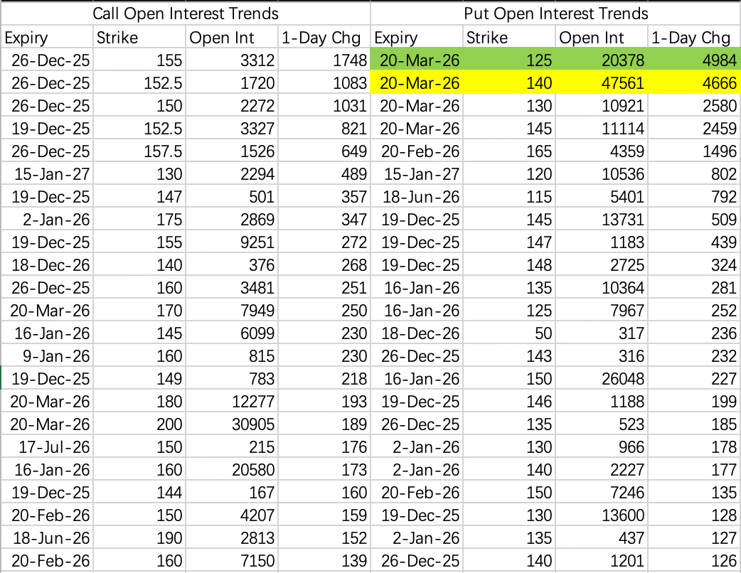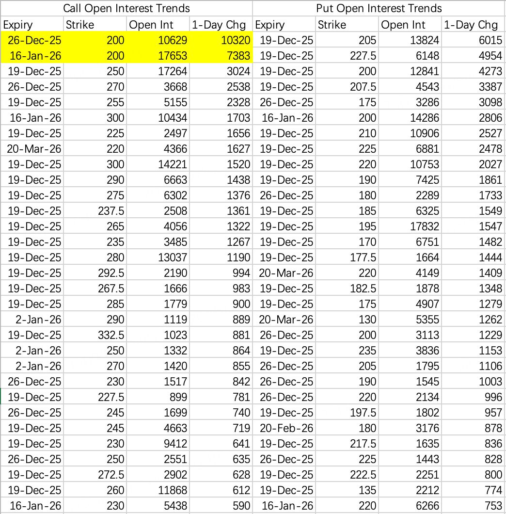 财报大单方面,出现了比较罕见的事件,大单买入价内call获得盈利,12月26日到期和1月16日到期200call $MU 20251226 200.0 CALL$ $MU 20260116 200.0 CALL$ ,分别开仓买入1万手和7383万手看涨。大单认为财报后股价在230~240左右。