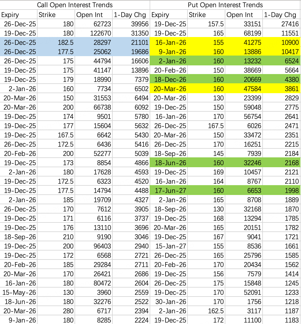 股价预期不太乐观,看跌期权开仓显示未来几周股价会去160走一遭。对于160这个价格看跌和抄底的都有,所以下周或下下周跌到160可以考虑sell put做空波动率或者抄底。