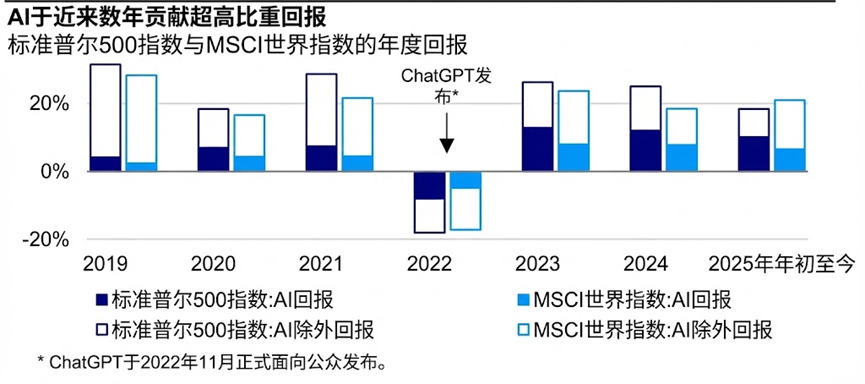 自从2022年底ChatGPT发布后,AI相关的回报开始主导全球表现。在2025年标普500指数的收益中,极少数的几家AI公司贡献了超过一半的回报。截止12月16日,英伟达的市值已经突破4.3万亿美金(数据来源:Wind)。作为一家硬件公司,这样的市值不禁让人疑问:AI还能继续涨下去吗?