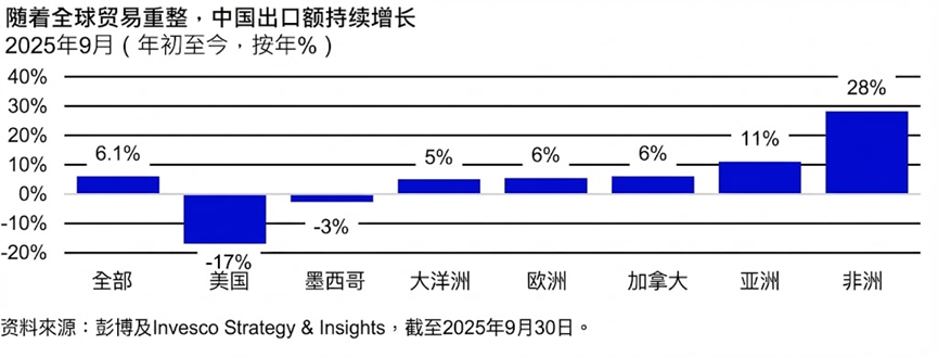 对于中国经济,景顺预计2026年GDP增速有望接近5%,增长动能来自扩大内需的政策和自主创新。从出口的角度看,2025年中国的出口保持增长,但结构发生了变化。相对美国的出口同比下降,但是非洲、亚洲的出口在双位数增长(数据来源:Invesco Strategy&Insights,截止2025年9月30日)。