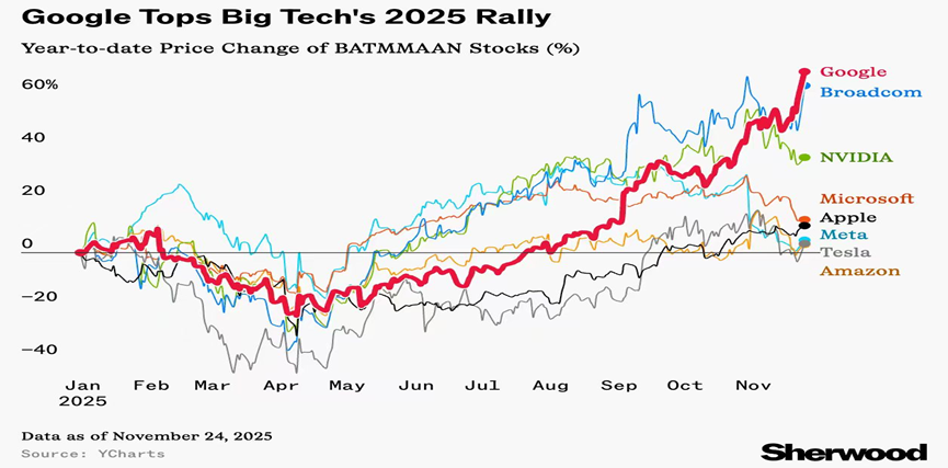 在投资策略上,美股“七巨头”是绕不开的话题。不同于2023-2024年“七巨头”(Magnificent Seven)齐头并进的盛况,2025年科技股内部出现了显著的裂痕,市场不再为所有的AI概念买单。以今年的表现看,伯克希尔买入的谷歌年内涨幅69%,领跑“七巨头”,远超苹果和微软。逻辑芯片巨头博通年内涨幅超60%,市值超越特斯拉。