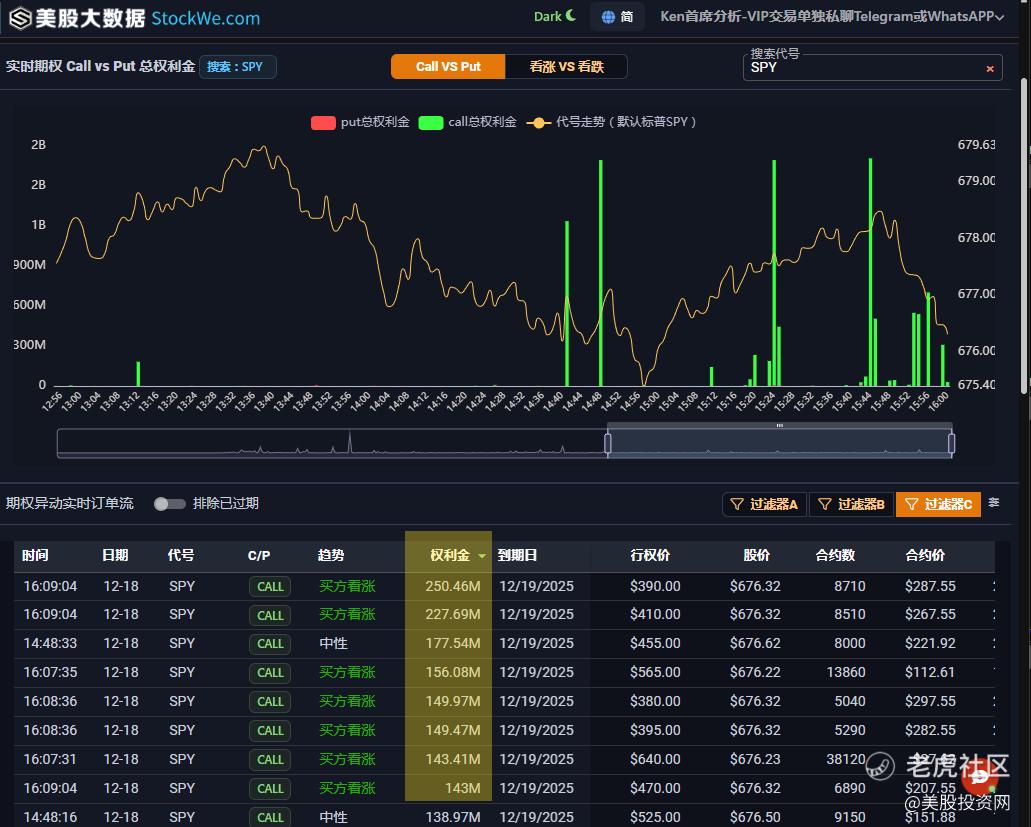 市场唯有站稳6800点上方,才能转入由卖出看跌期权支撑的稳定状态,但今天尾盘出现140亿美元的SPY看涨CALL成交,对比Put只有2.5亿美元,到期日是明天12月19日,深度价内期权