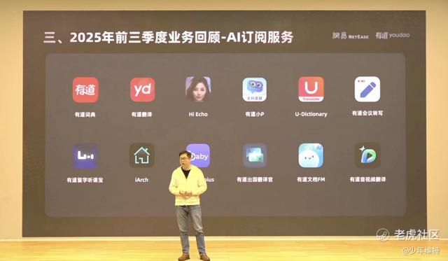 先说AI订阅。从2024年一季度约5000万元,到今年三季度约1亿元,六个季度翻倍。其中词典升级到V11,AI同传功能累计用户突破2000万;文档FM、音视频翻译等新应用也在补齐学习与工作场景。