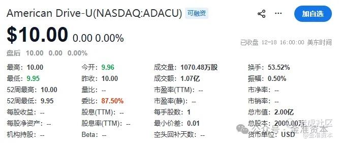 American Drive Acquisition在纳斯达克上市,股票代码为ADACU。Cantor Fitzgerald担任此次交易的唯一簿记管理人。