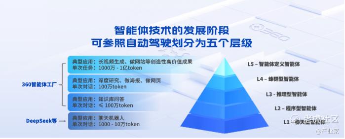 为这些定位变化提供支撑的,是如今被360放到台前的一系列AI Agent体系,在今年8月,360正式提出智能体L1-L5分级分类标准,根据智能体能满足的需求以及适配的场景对标自动驾驶正式定义Agent产品标准。