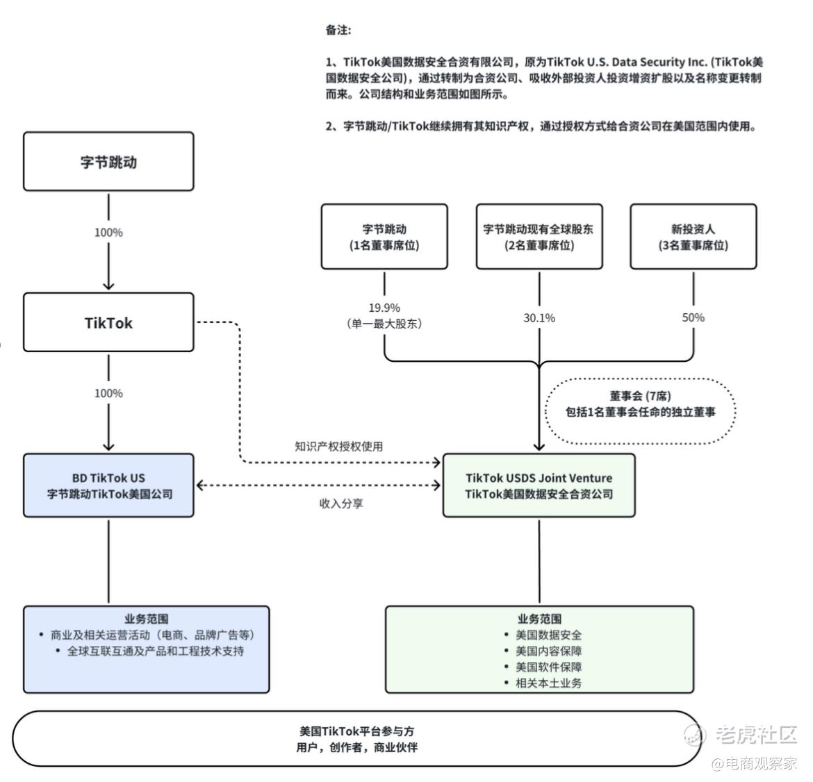 新架构的核心是两家独立运营主体的明确分工,字节跳动100%全资控股的“字节跳动TikTok美国公司”将保留核心商业控制权,负责电商、品牌广告、市场运营等盈利性业务,同时主导TikTok产品的全球互联互通。