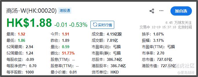 截至12月19日15时40分,商汤科技港股报1.88港元/股,市值为727.07亿港元,较2022年初高点已蒸发约八成。