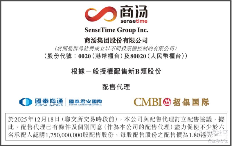 12月18日,商汤科技(00020.HK)又双叒叕配股融资了。公告称,商汤科技已委托配售代理尽力促使不少于六名承配人认购17.5亿股配售股份,每股配售价为1.80港元,较12月17日在联交所所报收市价每股1.97港元折让约8.63%。
