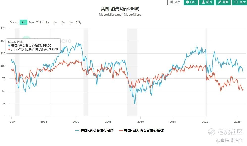 所以这两个季度起的美国消费信心加速下行,有可能实际美国国内的情况没这么差,只是4月起的关税开始完全传导兑现了,对冲了相当一部分的美股牛市财富效应。
