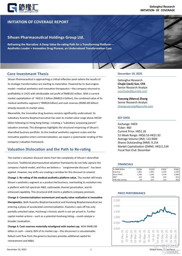 Sihuan Pharmaceutical is approaching a critical inflection point where the results of its strategic transformation are starting to materialize. Powered by its dual-engine model—medical aesthetics and innovative therapeutics—the company returned to profitability in 1H25 with attributable net profit of RMB103 million. With a current market capitalization of ~HK$11.5 billion (RMB10.4 billion), the combined value of its medical aesthetics segment (~RMB18 billion) and cash reserves (RMB3.89 billion) already exceeds its market value.
