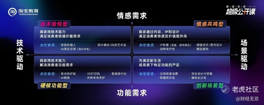 淘宝教育的解法是一套完整的赛道方法论。通过对高增赛道趋势品类进行深度分析,他们以技术-场景、情感-功能为核心象限,将高增赛道进一步提炼为四大类型,指导商家对号入座: