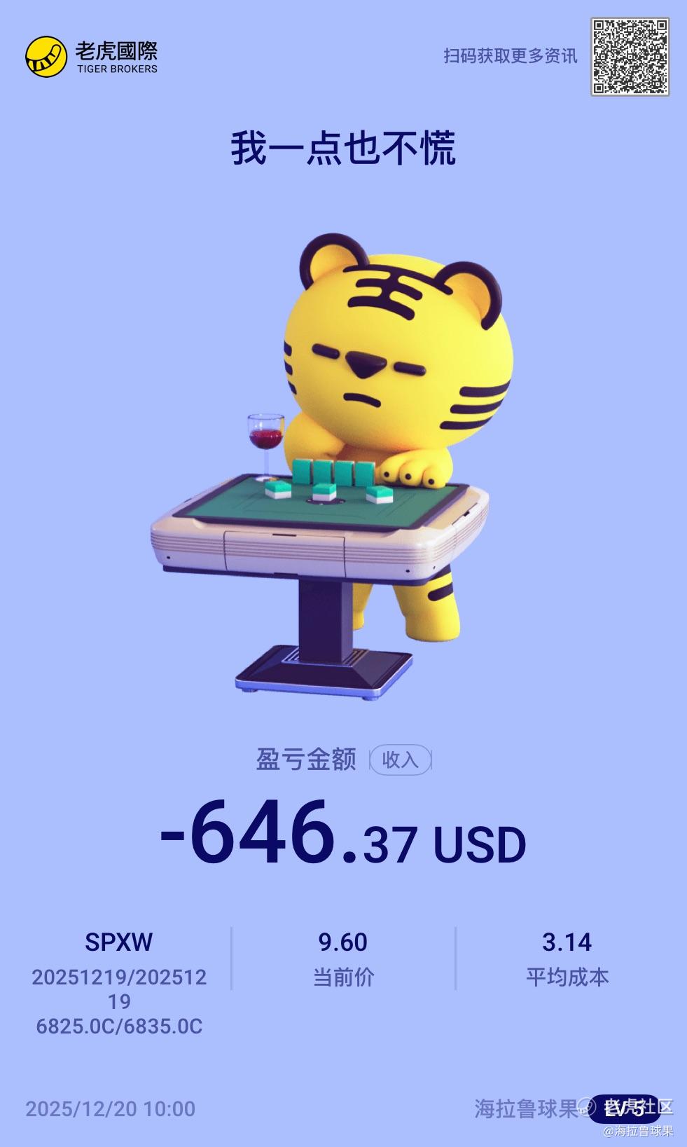$标普500 垂直价差 251219 CALL 6835.0/CALL 6825.0$ 很窝心的一笔交易,周四盈利状态因为睡觉没有止盈。周五盯盘一整晚,最后一刻大盘有个下跌,整体亏损只有 200,应该止损走,但心里想着已经最后了,盈亏已经最大了,就没有平仓。结果 5 点钟,瞬间亏 600。低估了各方面的复杂情况,教训太大了。瞬间亏 600,是因为保护腿瞬间没有价值了。教训有点多,老师这一单跟之前自己考虑的太少,没有结合宏观消息面,第一是美国降息和 CPI 预示下次大概率也降息,第二是日本白天加息的消息也落地,不算利空,第三是圣诞行情的可能存在。另外,没有牢记最大亏损。太窝心了。