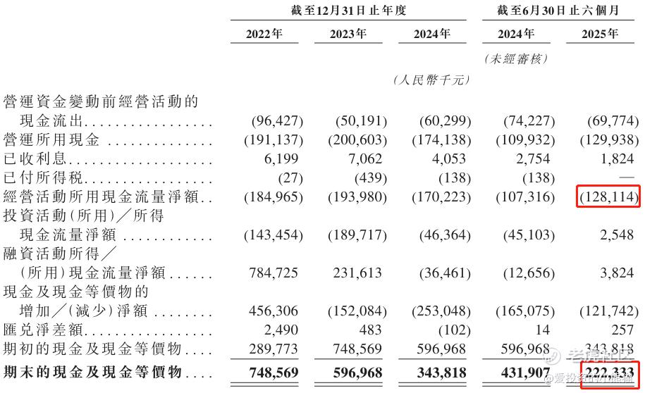 截至2025年6月30日,公司账上现金有人民币2.22亿元,经营活动现金流为-1.28亿元。