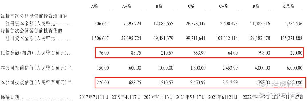 6. D轮:2022年4月7日达成协议,代价金额约7.98亿元人民币,每股成本约16.58元人民币,投后估值为47.98亿元人民币,发售价折让约64.61%。