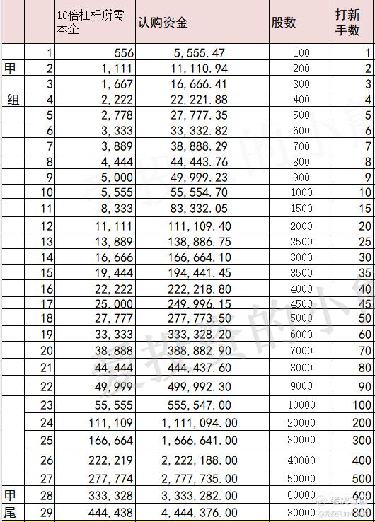 甲组的各档融资所需要的本金还有融资金额对应如下表: