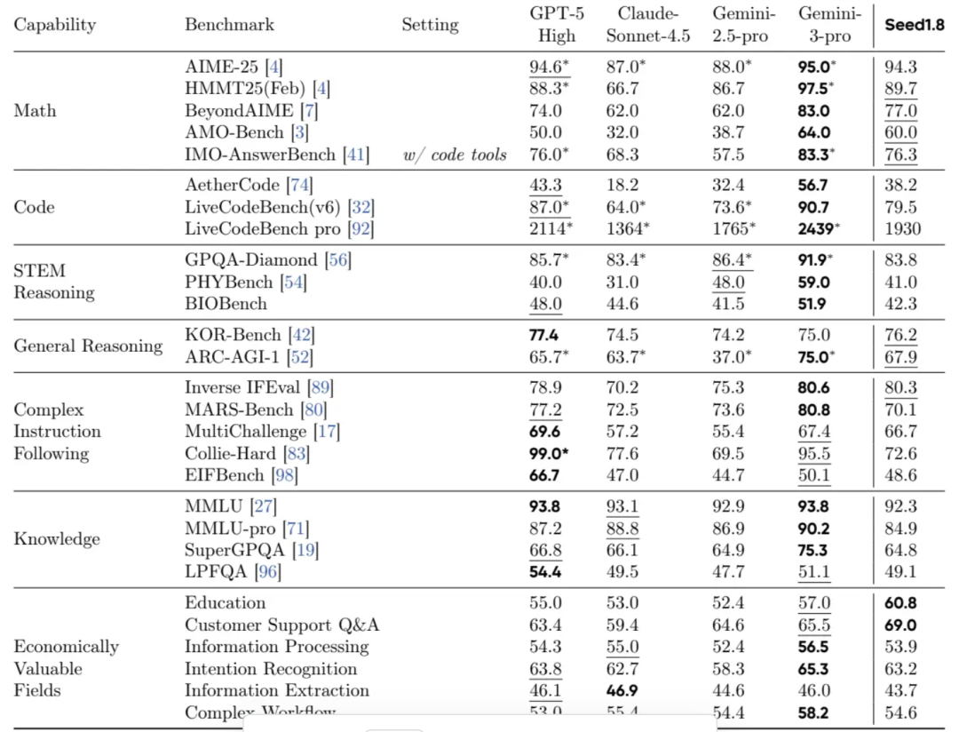 报告里的第一张表直接把 豆包1.8 拉去跟 GPT-5 High、Claude Sonnet-4.5、Gemini 2.5 Pro、Gemini 3 Pro 同台对打。