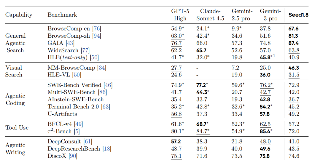具体而言豆包大模型1.8在GAIA、BrowseComp-en、BrowseComp-zh、WideSearch这几个benchmark上高于GPT-5 High 和Gemini 3 Pro。