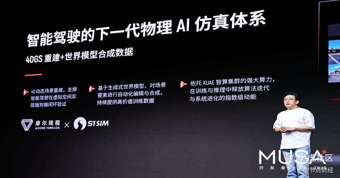 12月20日,在摩尔线程MUSA开发者大会主题演讲中,摩尔线程创始人、董事长兼CEO张建中重点介绍了摩尔线程与五一视界(51WORLD)旗下仿真平台51Sim围绕KUAE智算集群构建下一代物理 AI 仿真体系的深度合作。双方以国产 GPU 大规模算力为基础,以新一代仿真与世界模型技术为核心,共同探索面向端到端智能驾驶、具身智能的物理 AI 基础设施建设路径。