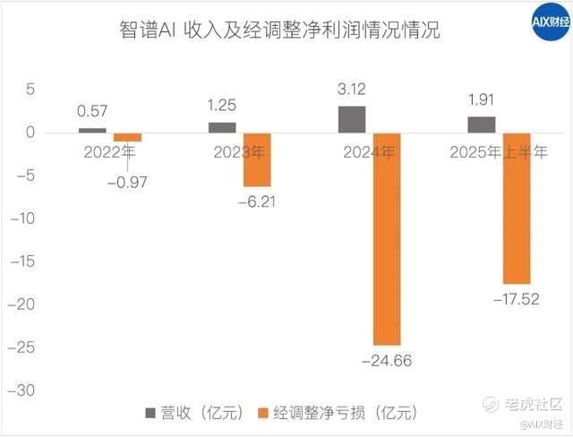 排名背后,另一组数字同样醒目。2024年,智谱AI经调整净亏损达24.7亿元。2025年上半年亏损仍在加剧,营收1.9亿元对应经调整净亏损17.5亿元。